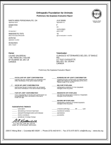 Gloria a complété sa certification de santé CHIC de l’OFA https://ofa.org/ Elle a réussi tous les tests de santé requis et plus. Nous continuerons de valider sa certification en lui faisant faire un examen des yeux annuel par un vétérinaire ophtalmologiste.