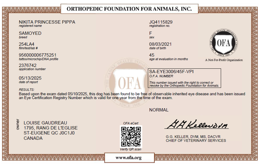 Pippa est a complété sa certification de santé CHIC de l’OFA  https://ofa.org/  Nous continuerons de valider en lui faisant faire un examen des yeux annuel par un vétérinaire ophtalmologiste.